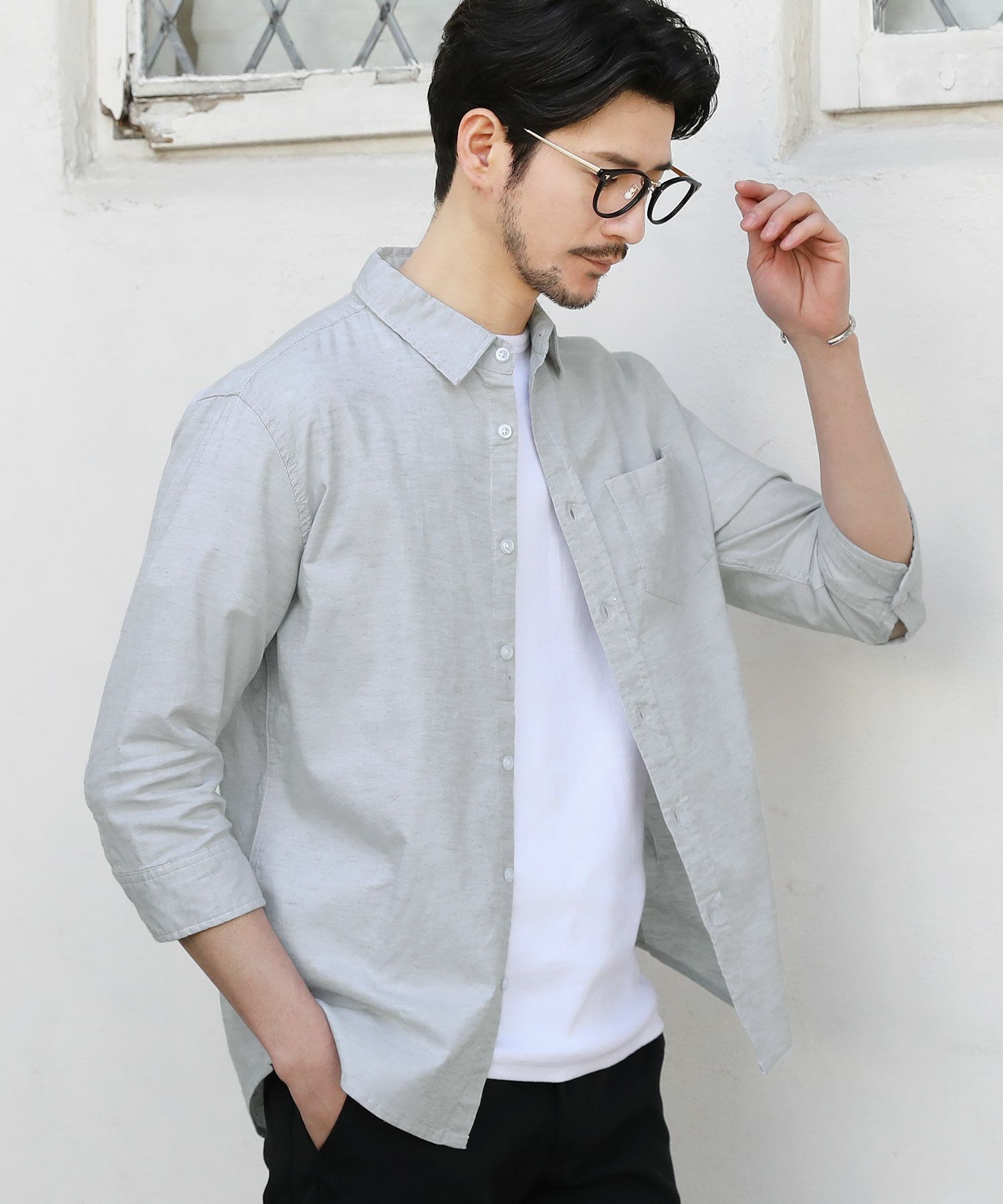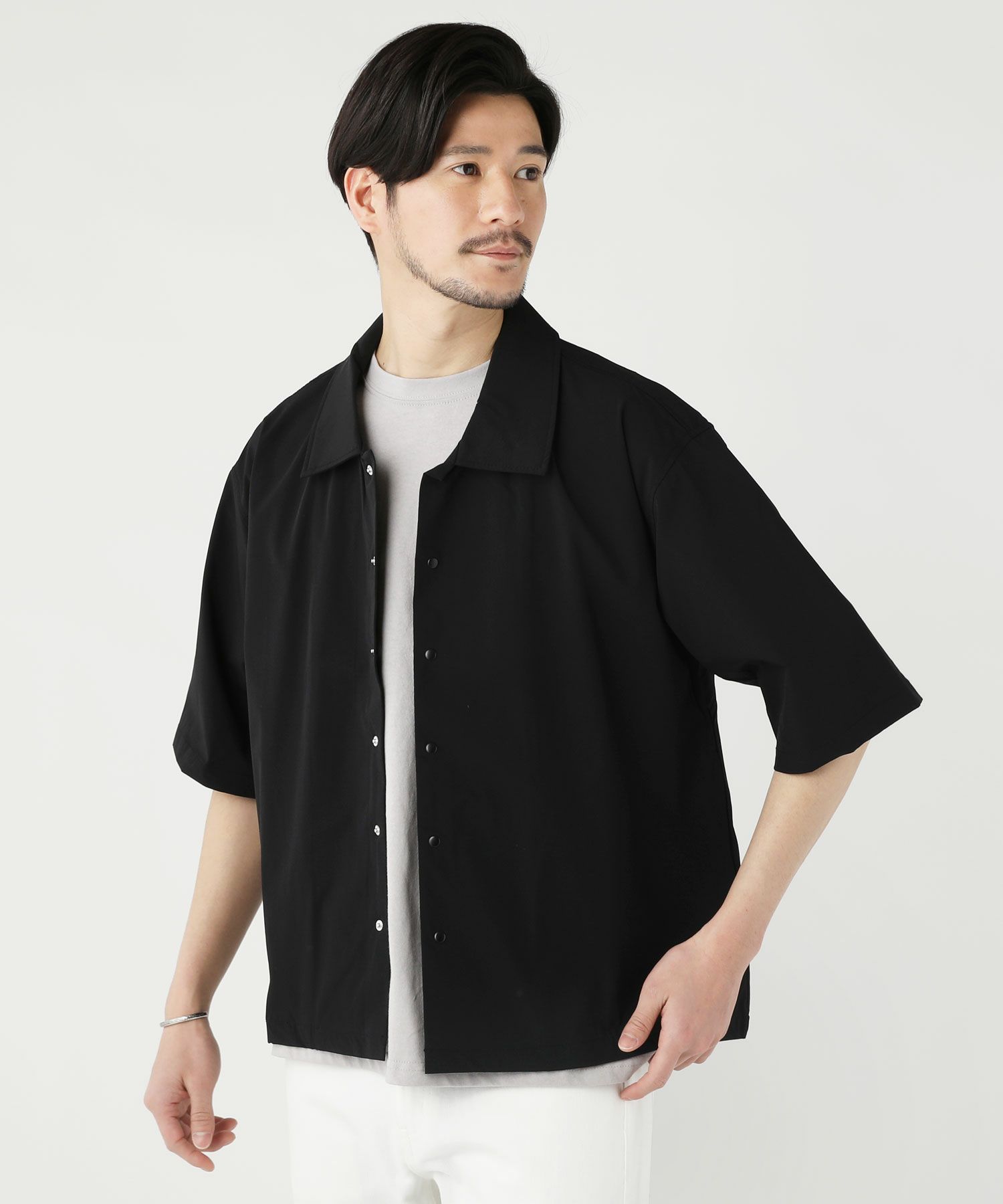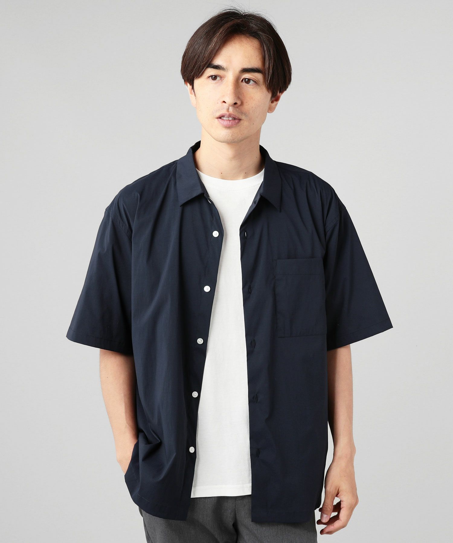 黒、または紺色シャツに白のTシャツにすれば涼しく着こなせます