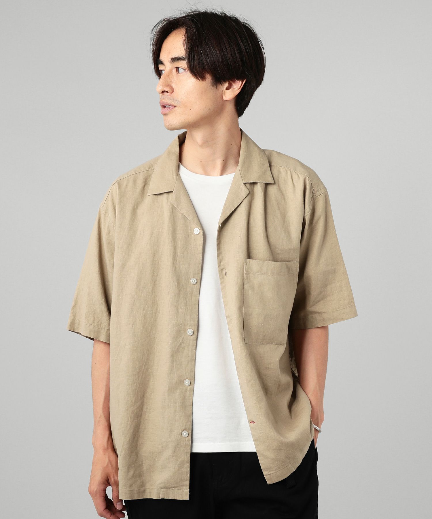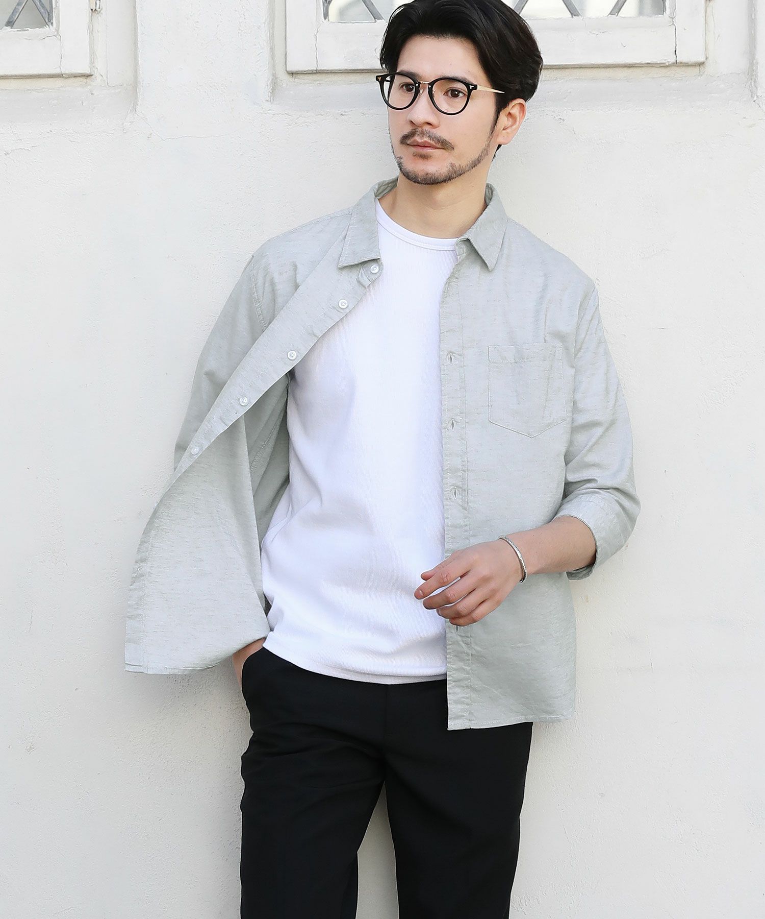カーキのワイドパンツで、涼し気なシャツを合わせると、似たような雰囲気は出せますね
