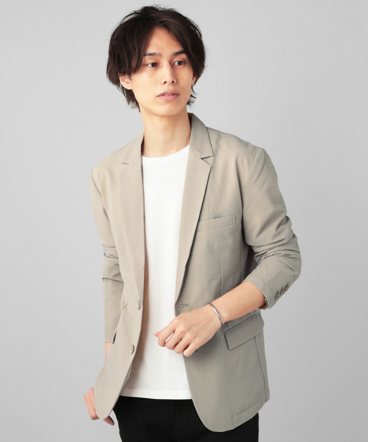 ベージュのテーラードジャケットを着ていますね
