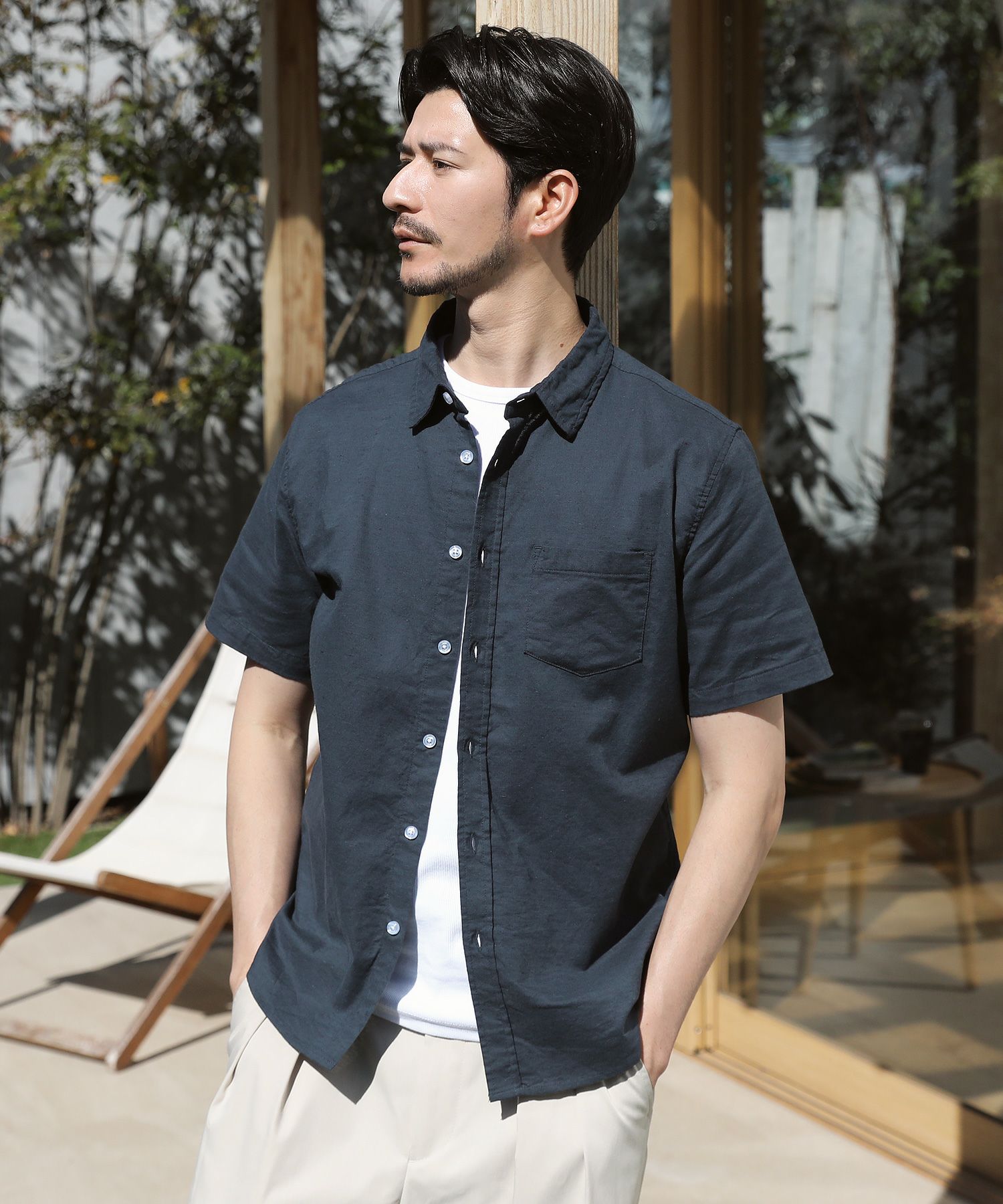 先染め綿麻ストレッチレギュラーカラー半袖シャツ
