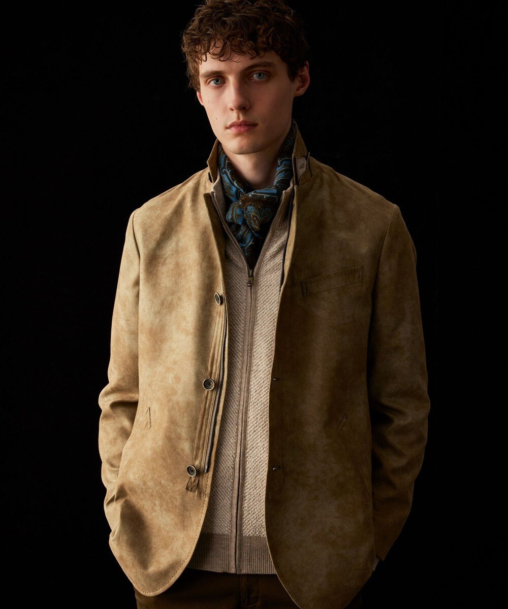 素材軽量でしなやかな風合いが特長のスウェード素材。シワになりにくく、ベロアのような光沢感の上に薄くムラのあるプリントをしている為、繊細な濃淡表現で仕上げているJOSEPH ABBOUDオリジナル素材。撥水加工をしている為、雨に降られてもリアルレザーのようなウォータースポットを気にせずに着用できます